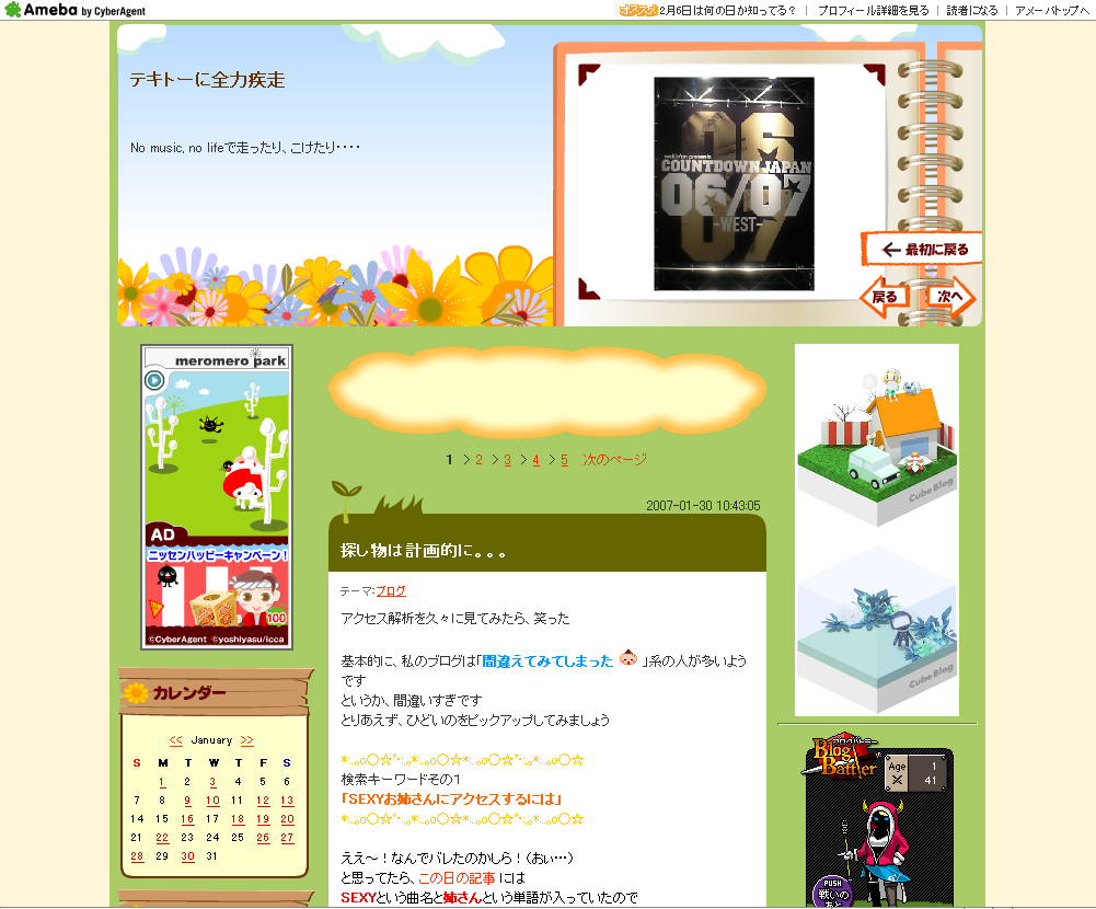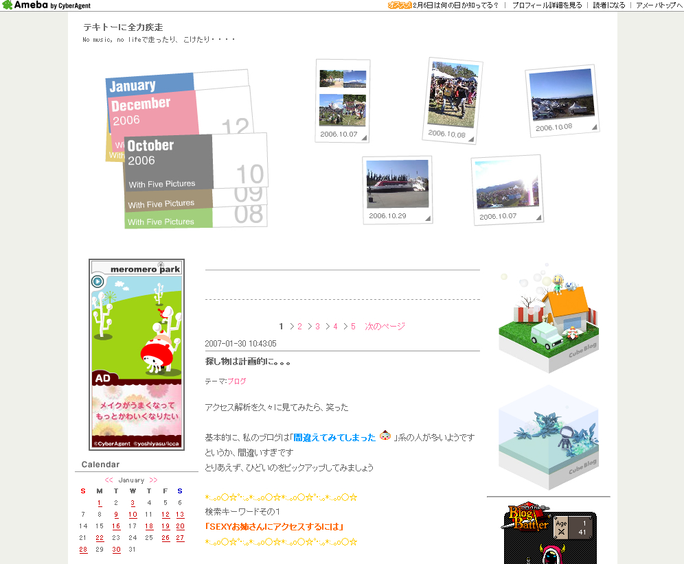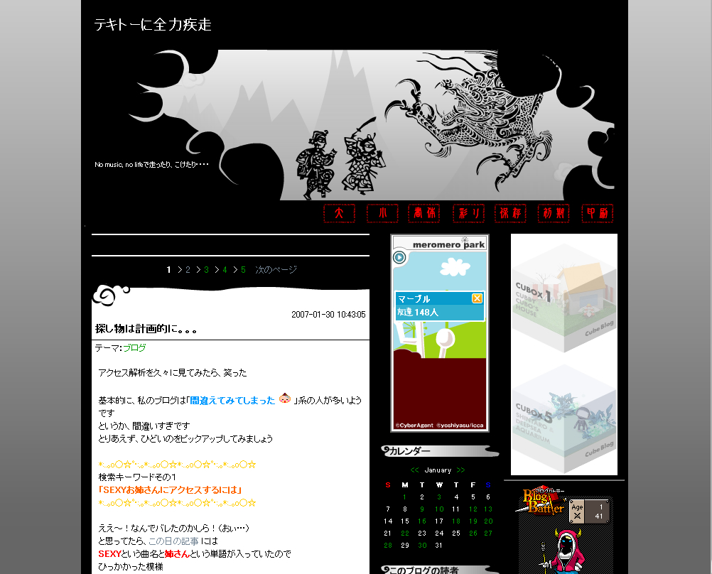 実験的ブログスキン。投稿者のブログ写真をランダムに表示するFlashヘッダ。写真取得のAPI作成(Java)からAS実装、デザインまですべて一人で完結しています。